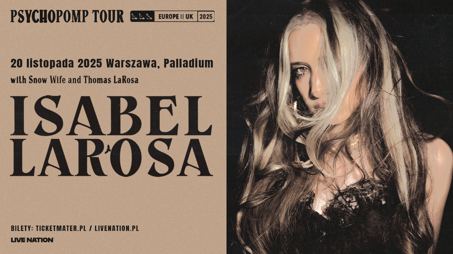 Sensacja alt-popowa i artystka z platynową płytą — Isabel LaRosa — ogłosiła swoją trasę koncertową „Psychopomp Tour” na 2025 rok, obejmującą Europę i Wielką Brytanię. Trasa, której producentem jest Live Nation, została zapowiedziana po premierze debiutanckiego albumu LaRosy pt. Raven.